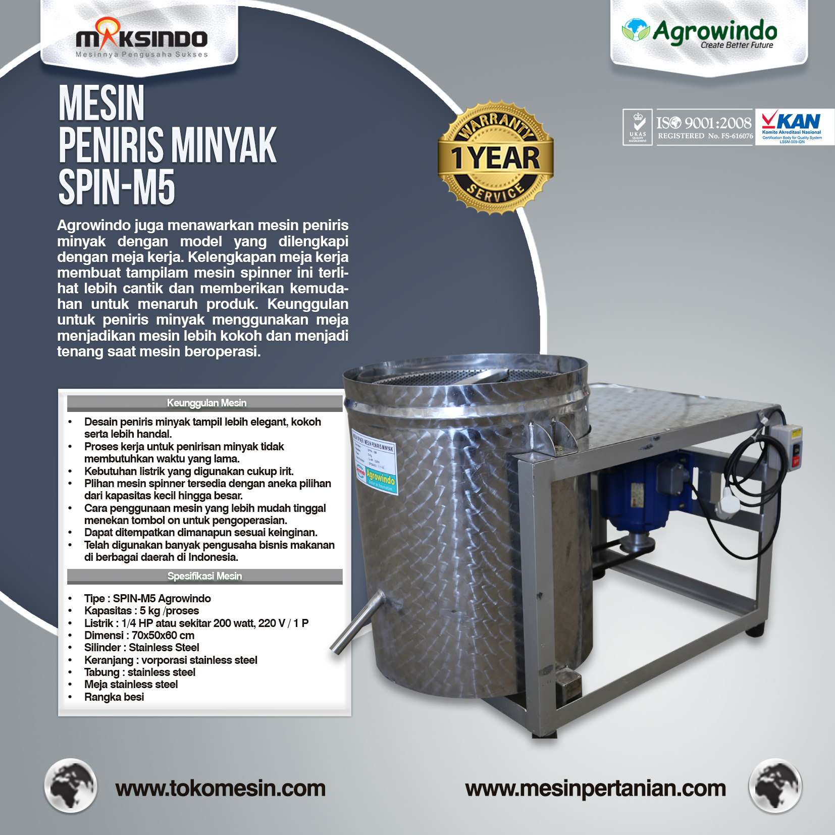 Mesin spinner peniris minyak Maksindo, kini bisa Anda dapatkan di semua cabang toko mesin Maksindo. Mesin spiner atau yang di sebut juga dengan mesin pengering minyak ini sangat berguna bagi banyak usaha kuliner, terutama yang berhubungan dengan proses pengorengan bahan makanan
