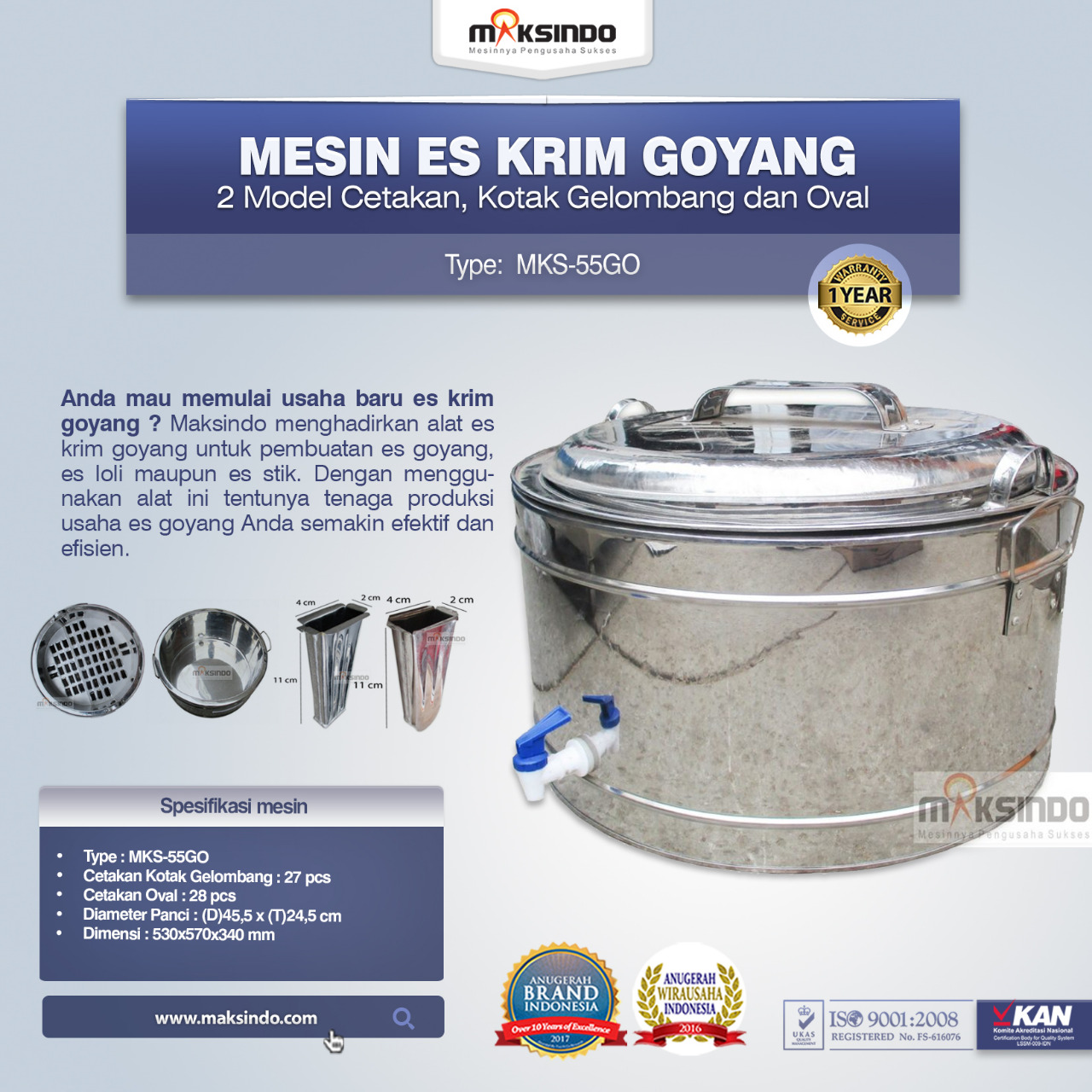Anda mau memulai usaha baru es krim goyang ? Maksindo menghadirkan alat es krim goyang untuk pembuatan es goyang, es loli maupun es stik. Dengan menggunakan alat ini tentunya tenaga produksi usaha es goyang Anda semakin efektif dan efisien.