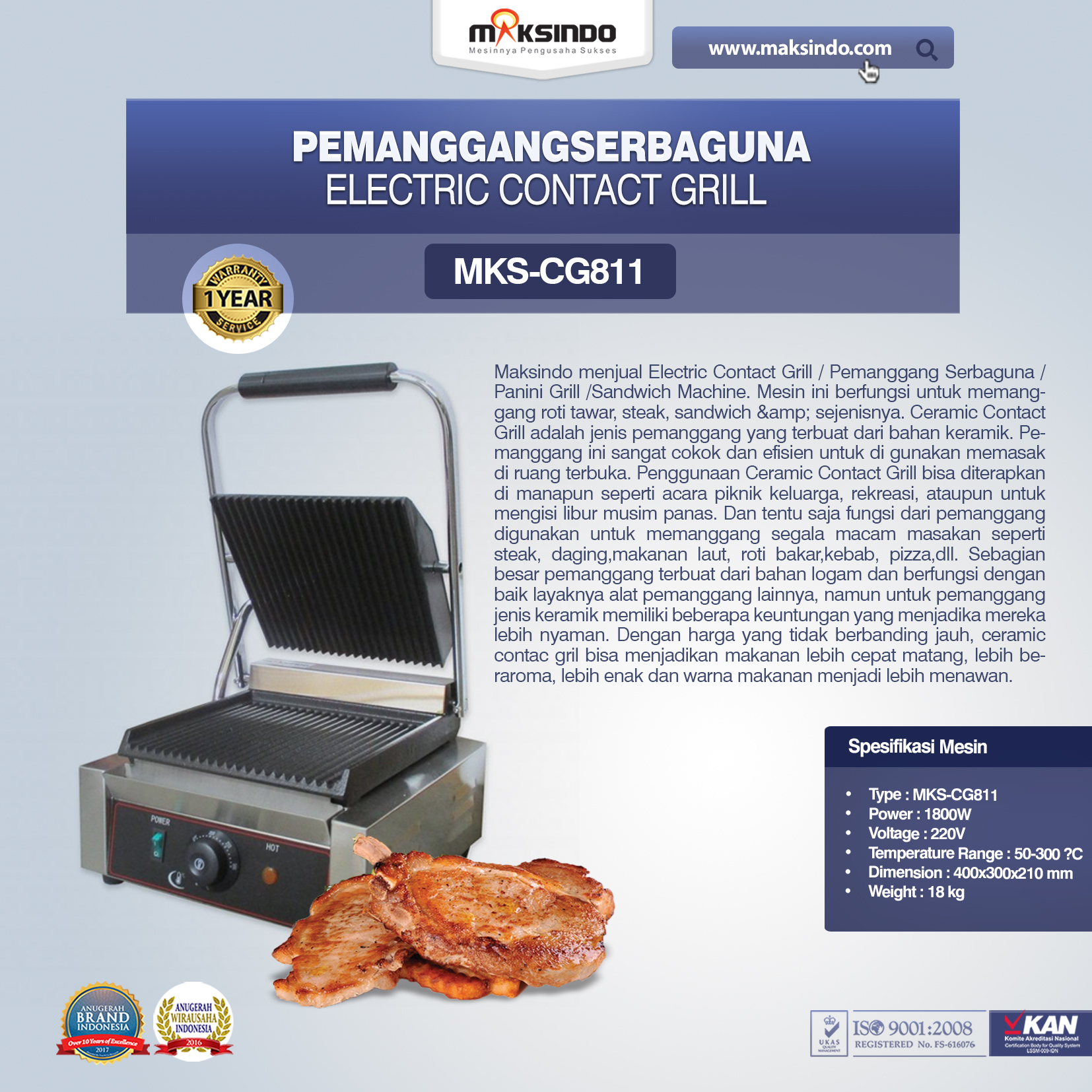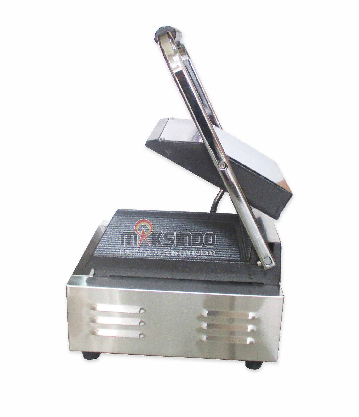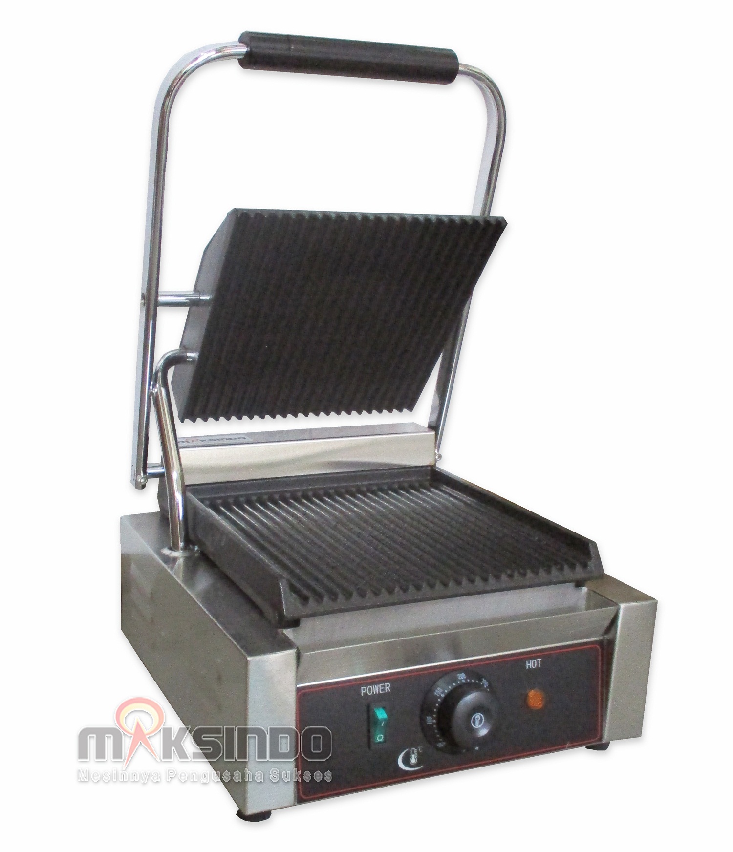 Maksindo menjual Electric Contact Grill / Pemanggang Serbaguna / Panini Grill /Sandwich Machine. Mesin ini berfungsi untuk memanggang roti tawar, steak, sandwich & sejenisnya. Ceramic Contact Grill adalah jenis pemanggang yang terbuat dari bahan keramik. Pemanggang ini sangat cokok dan efisien untuk di gunakan memasak di ruang terbuka. Penggunaan Ceramic Contact Grill bisa diterapkan di manapun seperti acara piknik keluarga, rekreasi, ataupun untuk mengisi libur musim panas. Dan tentu saja fungsi dari pemanggang digunakan untuk memanggang segala macam masakan seperti steak, daging,makanan laut, roti bakar,kebab, pizza,dll. Sebagian besar pemanggang terbuat dari bahan logam dan berfungsi dengan baik layaknya alat pemanggang lainnya, namun untuk pemanggang jenis keramik memiliki beberapa keuntungan yang menjadika mereka lebih nyaman. Dengan harga yang tidak berbanding jauh, ceramic contac gril bisa menjadikan makanan lebih cepat matang, lebih beraroma, lebih enak dan warna makanan menjadi lebih menawan.