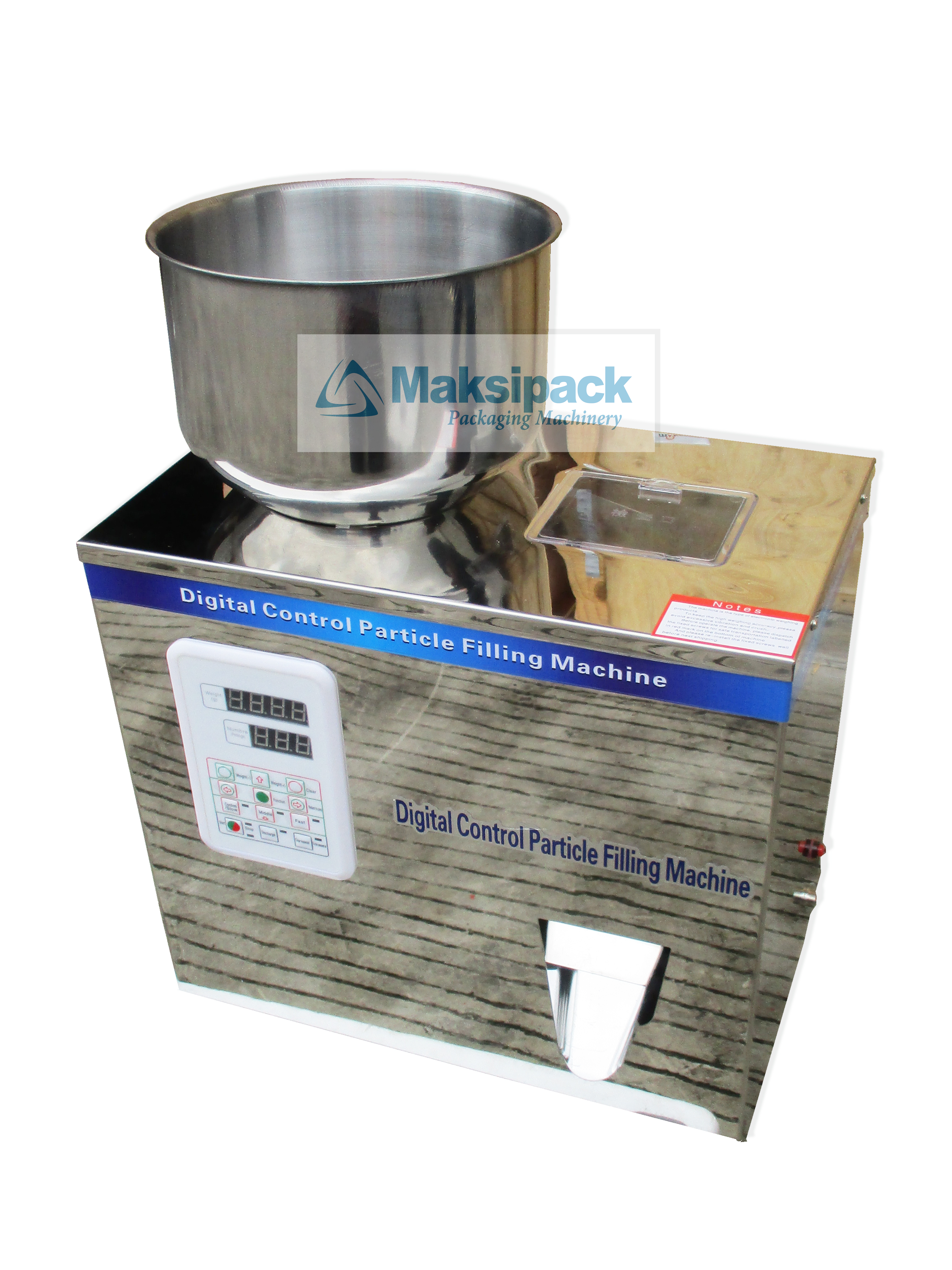 Dengan mesin ini, Anda bisa mengisi kemasan produk disertai penimbangan yang cukup akurat. Produk yang bisa menggunakan mesin ini berjenis tepung dan granule. Tentu harus produk kering.
