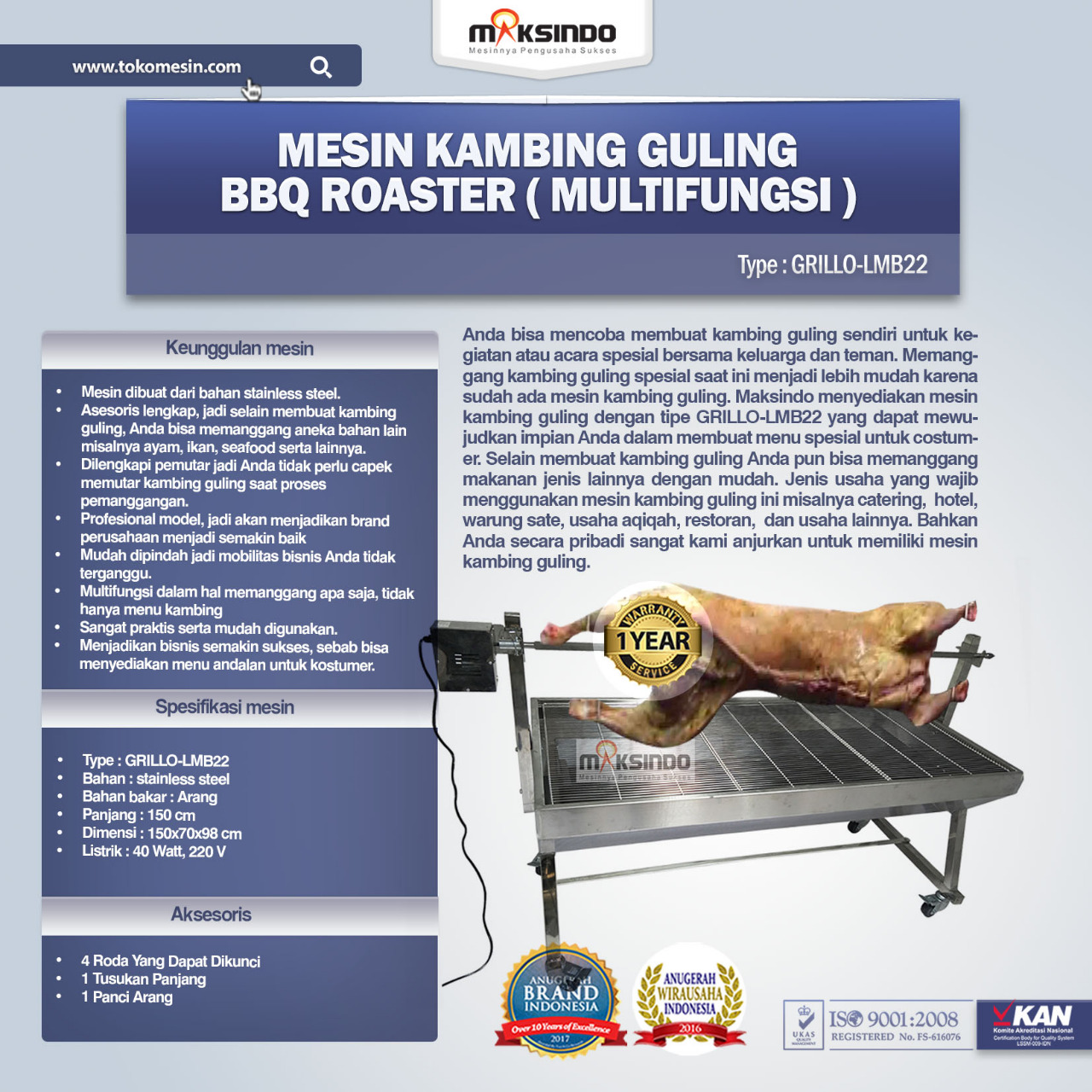 - Asesoris yang lengkap, bisa digunakan untuk memanggang selain kambing guling misalnya ayam, ikan, seafood dan lainnya.