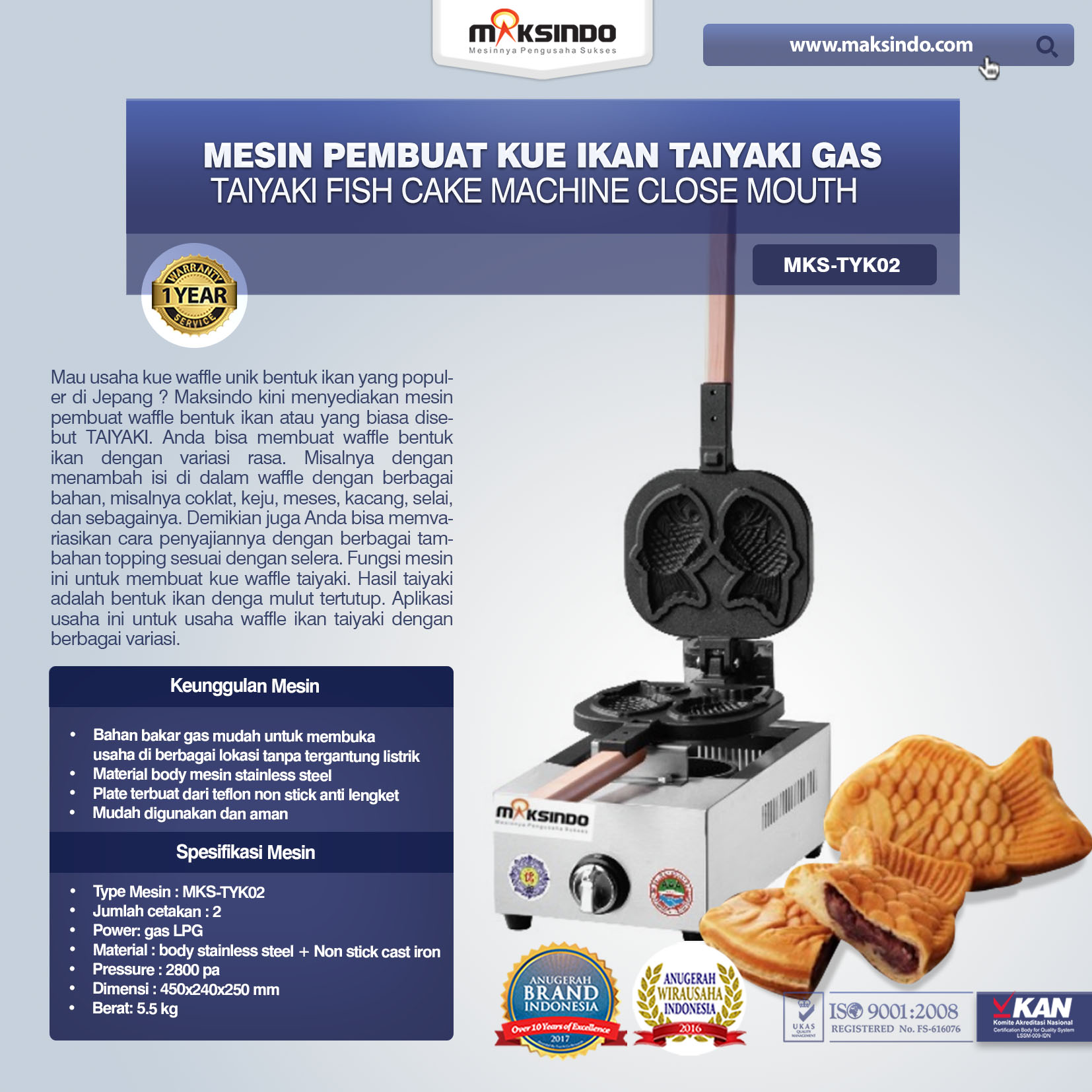 Spesifikasi Mesin Cetakan Kue Taiyaki Gas Maksindo