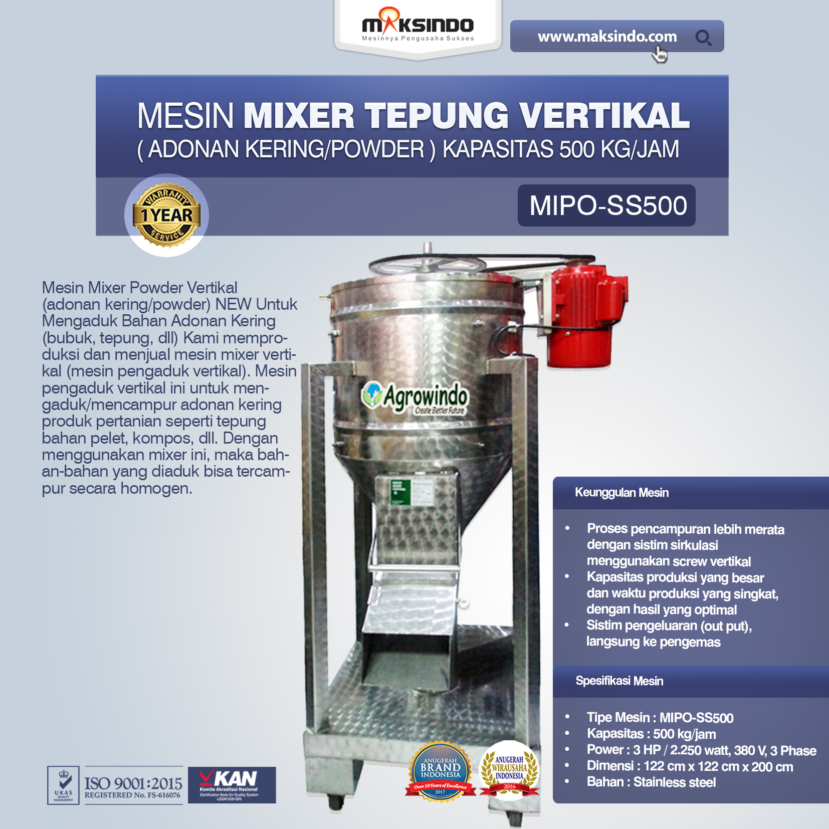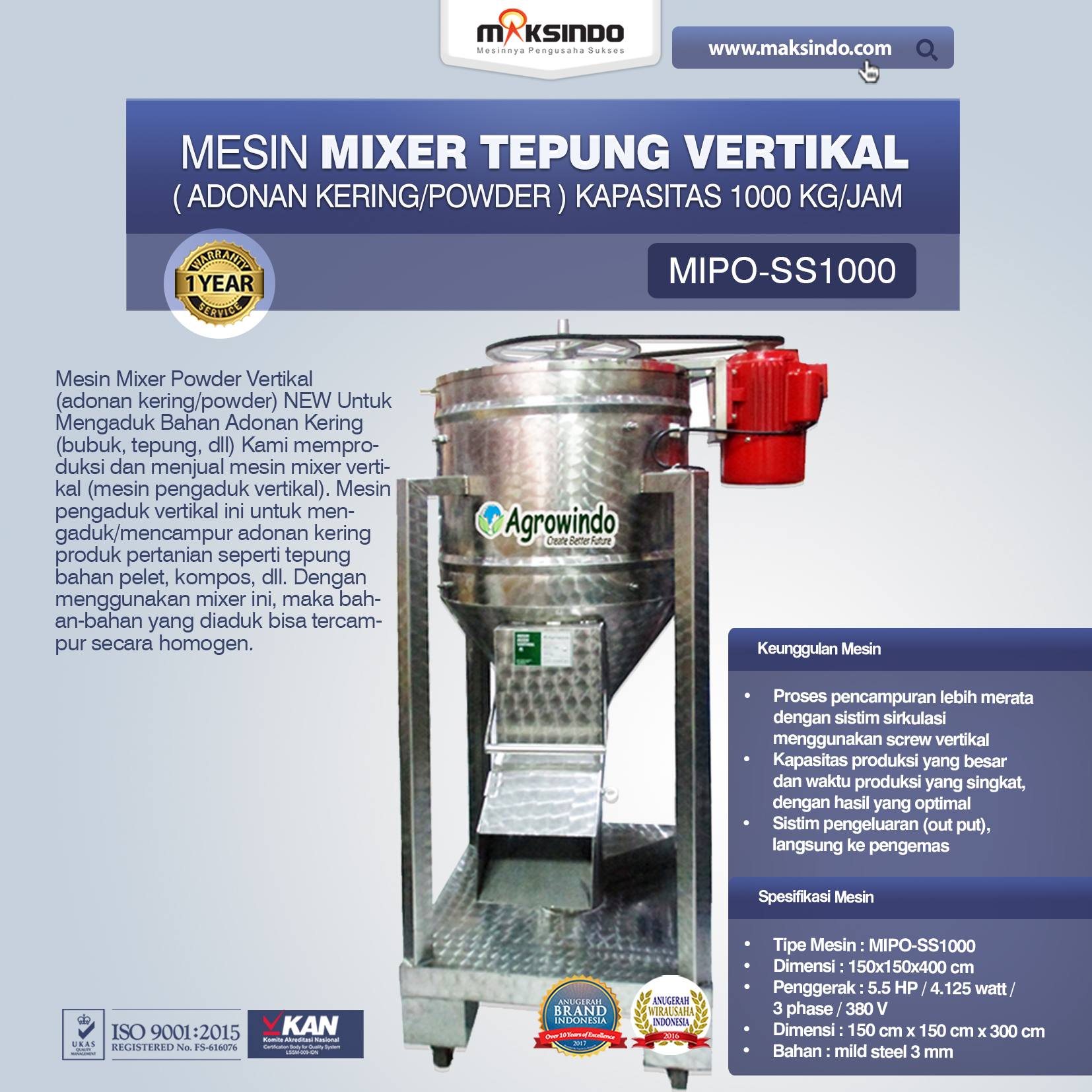 Mesin mixer vertikal yaitu salah satu mesin usaha yang dapat dimanfaatkan untuk mencampurkan bahan adonan kering (bubuk, tepung, dll). Saat ini di Toko Mesin Maksindo sudah menhadirkan dan menawarkan mesin mixer vertikal (mesin pengaduk vertikal). Dengan menggunakan mixer ini, maka bahan-bahan yang diaduk dapat tercampur secara berkualitas.