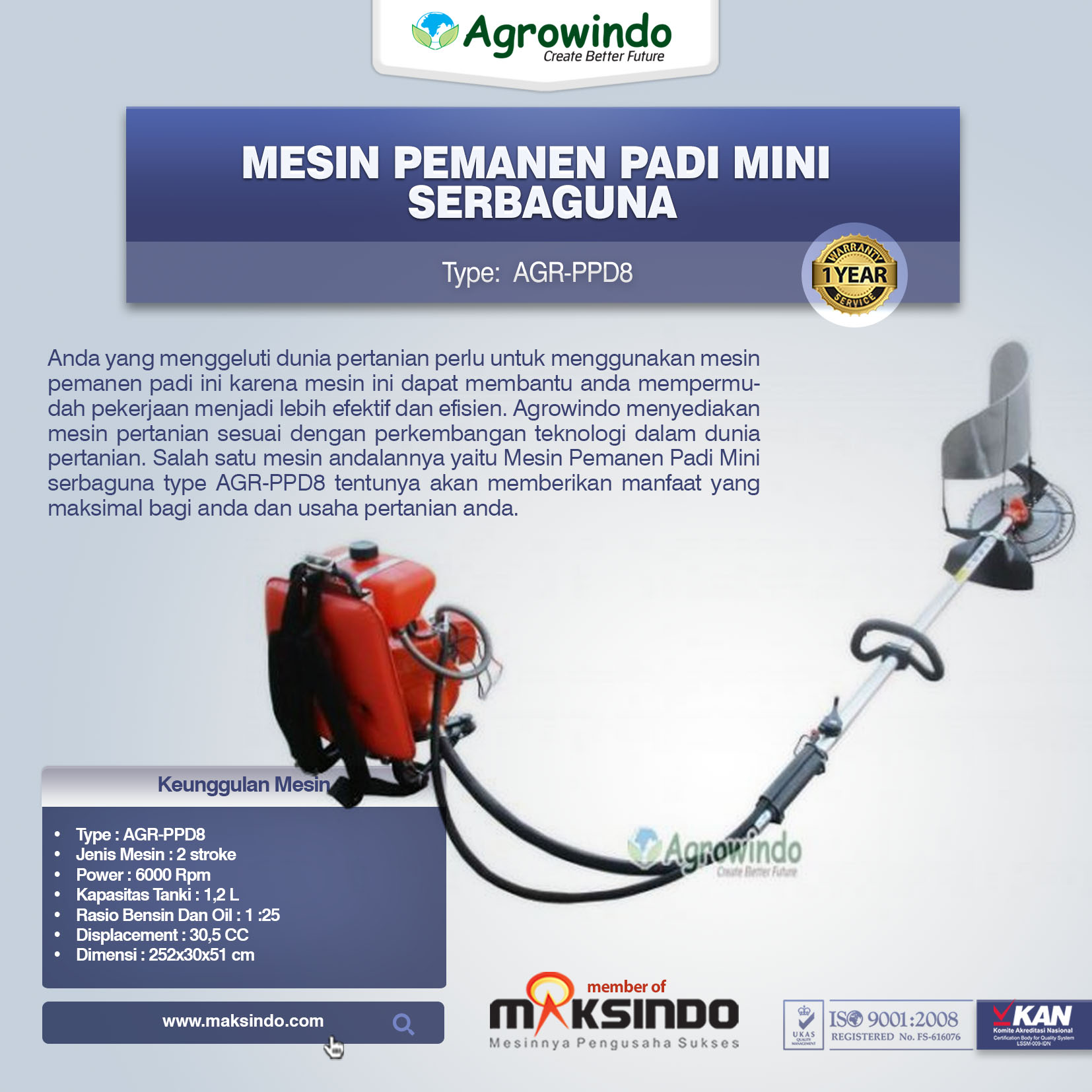 Anda yang menggeluti dunia pertanian perlu untuk menggunakan mesin pemanen padi ini karena mesin ini dapat membantu anda mempermudah pekerjaan menjadi lebih efektif dan efisien. Agrowindo menyediakan mesin pertanian sesuai dengan perkembangan teknologi dalam dunia pertanian. Salah satu mesin andalannya yaitu Mesin Pemanen Padi Mini serbaguna type AGR-PPD8 tentunya akan memberikan manfaat yang maksimal bagi anda dan usaha pertanian anda.