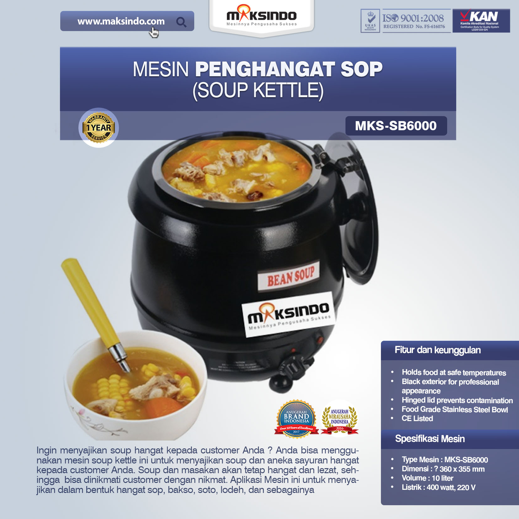 Ingin menyajikan soup hangat kepada customer Anda ? Anda bisa menggunakan mesin soup kettle ini untuk menyajikan soup dan aneka sayuran hangat kepada customer Anda. Soup dan masakan akan tetap hangat dan lezat, sehingga bisa dinikmati customer dengan nikmat