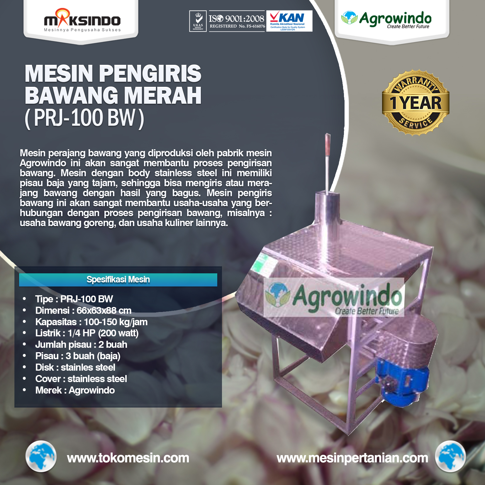 Spesifikasi Mesin Pengiris Bawang Agrowindo :