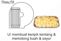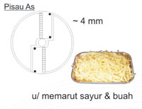 Fungsi mesin ini : memotong, mengiris, memarut buah dan sayuran dengan berbagai bentuk ukuran dan potongan. Bisa juga untuk keju, almond, coklat batangan, dan bread-crumb
