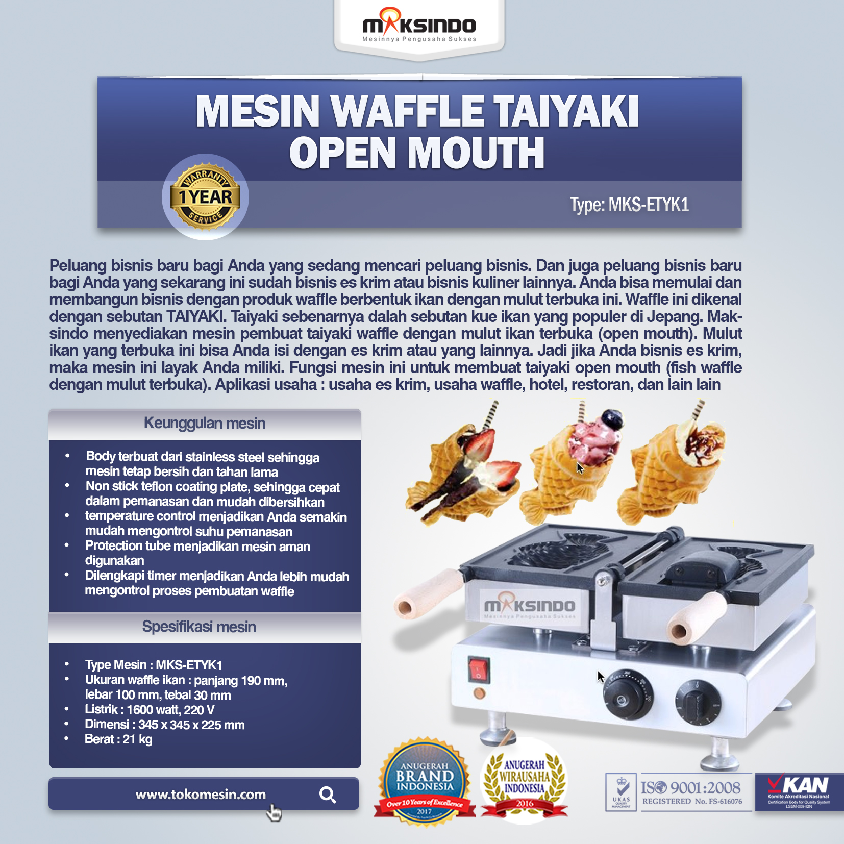 Maksindo menyediakan mesin pembuat taiyaki waffle dengan mulut ikan terbuka (open mouth). Mulut ikan yang terbuka ini bisa Anda isi dengan es krim atau yang lainnya. Jadi jika Anda bisnis es krim, maka mesin ini layak Anda miliki