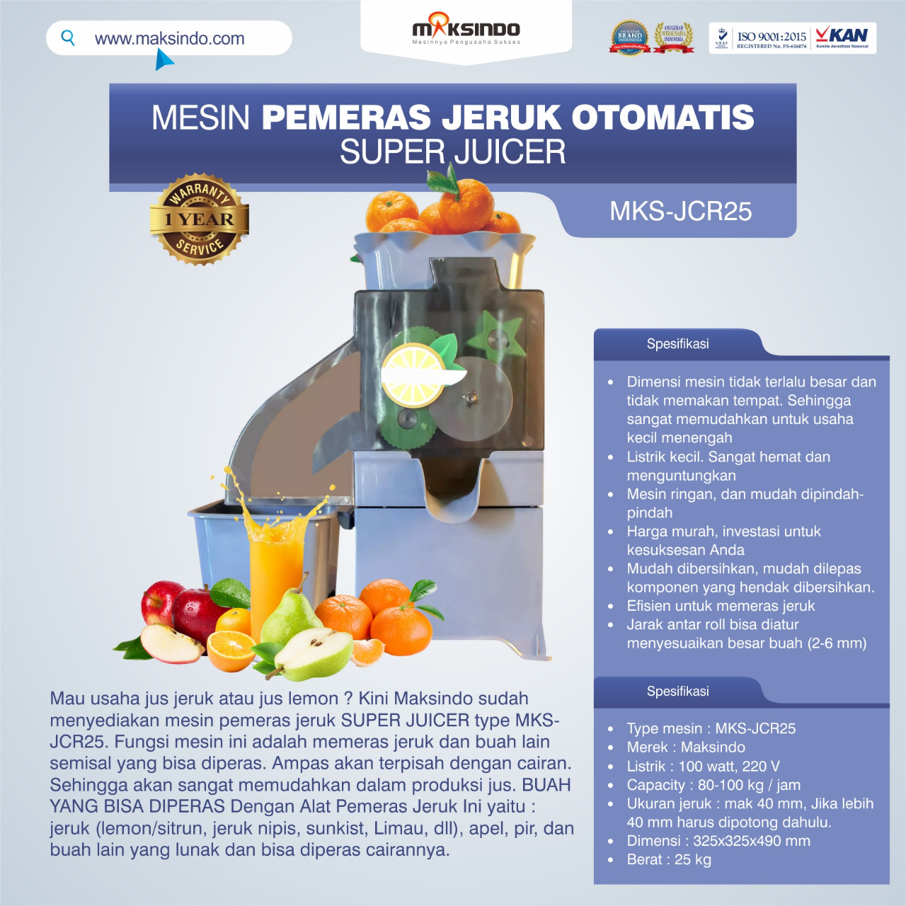 Jual Mesin Pemeras Jeruk Otomatis Super Juicer MKS-JCR25 di Yogyakarta