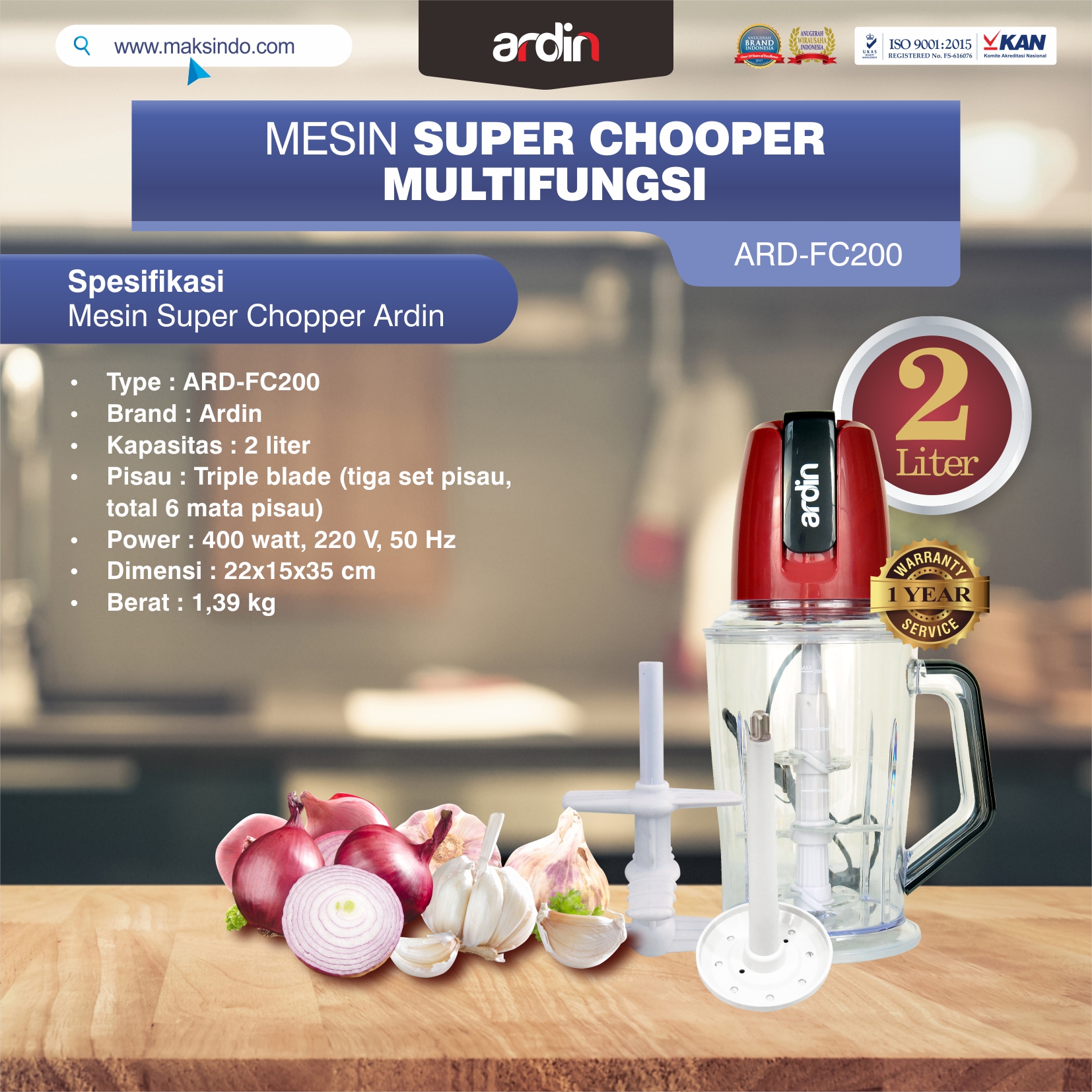 Berminat menghasilkan berbagai makanan dan minuman sendiri di rumah dengan gampang dan cepat. sekarang sudah tersedia mesin food chopper multifungsi ARD-FC200 Ardin. Dengan mesin food chopper multifungsi ini, Anda dapat mengolah jus, ice smoothies, menggiling daging, mencacah sayur, menggiling bumbu, mpasi anak, membuat bakso, mengupas bawang, dan lainnya. Jadi satu mesin bisa Anda gunakan untuk bermacam macam keperluan di dapur Anda. Anda akan semakin betah di dapur untuk menyediakan bermacam macam makanan dan minuman untuk keluarga tercinta. Cocok nih untuk ibu-ibu muda yang tidak ingin ribet saat di dapur. Menyingkat waktu dalam proses memasak atau menyediakan minuman untuk keluarga atau saat ada tamu. Mesin ini dilengkapi dengan pisau yang tajam sehingga memudahkan proses menggiling daging. Selain itu, mesin food chopper multifungsi ARD-FC200 Ardin terbuat dari stainless yang membuat tampilan produk ini lebih mewah. Satu paket mesin food chopper multifungsi ARD-FC200 Ardin terdapat 1 Chopper 2 liter, 1 pengocok telur, 1 pengupas bawang, 3 set pisau. Satu mesin terdapat Triple blade (tiga set pisau, total 6 mata pisau. Terbuat dari baja stainless bedah yang tidak akan bengkok atau berkarat dan dirancang untuk memotong dengan cepat. Mesin ini juga tidak terlalu berat jadi mudah di pindahkan. Daya untuk listrik nya pun juga tidak terlalu besar, sehingga tidak khawatir untuk daya listrik rumah nya yang kecil.
