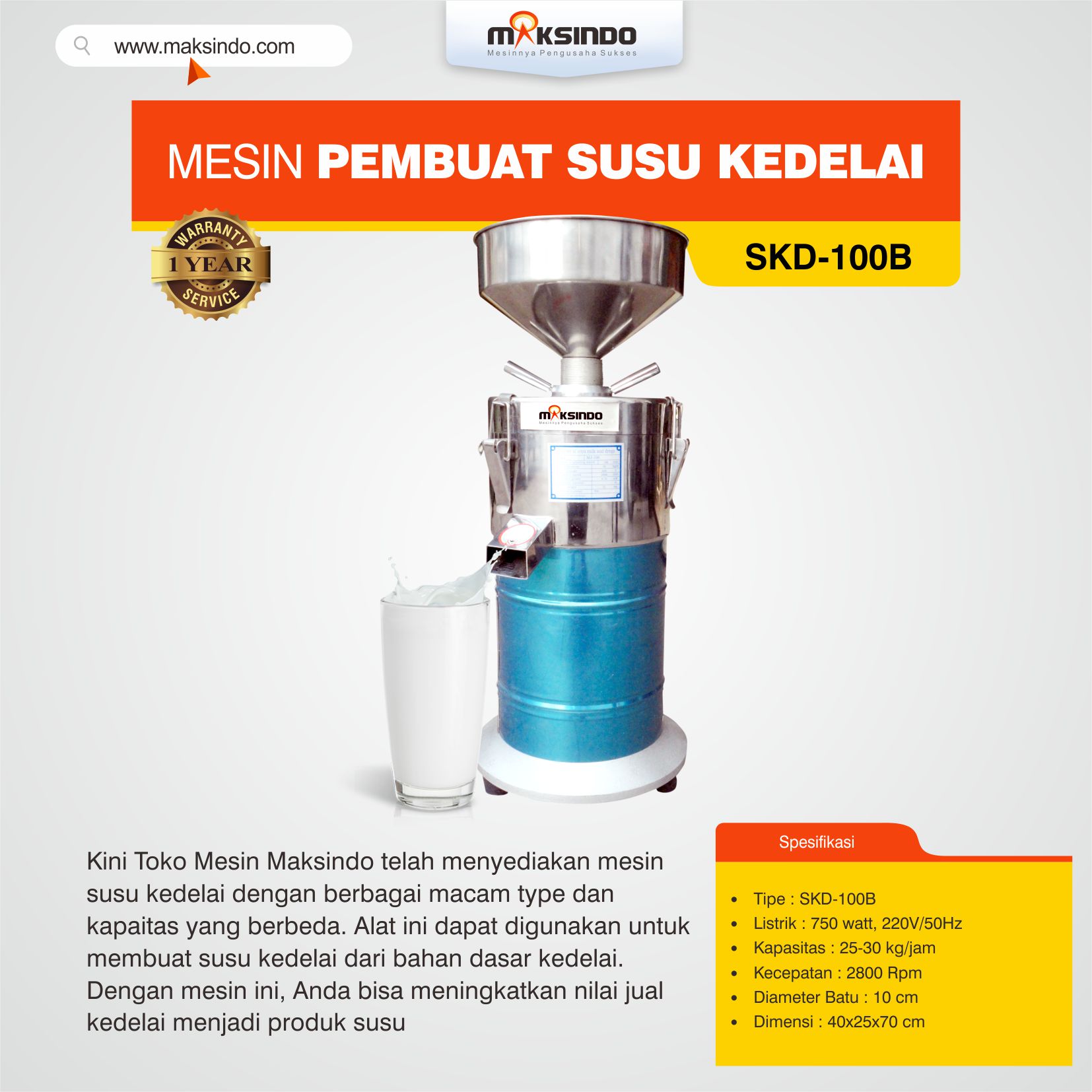Maksindo kini menyediakan mesin minuman berkualitas yang menguntungkan untuk usaha. Yakni mesin susu kedelai yang mampu Anda gunakan dalam usaha minuman kedelai. Dengan memakai mesin susu kedelai maka akan menciptakan susu kedelai dengan cara yang mudah dan gampang. pemakaian mesin susu kedelai ini sangat membantu dalam proses pembuatan susu kedelai, yang mana proses penggiling kedelai menjadi sari kedelai. Mesin susu kedelai dari maksindo hadir dengan pilihan tipe SKD-100B. Penggunaan SKD-100B ini mampu dipakai dengan kapasitas pemakaian 25-30 kilogram per jam. Dalam pengoperasiannya mesin susu kedelai ini memerlukan konsumsi listrik 0.75 kW. Desain tampilan mesin susu kedelai ini juga sangat baik dengan bahan material yang berkualitas